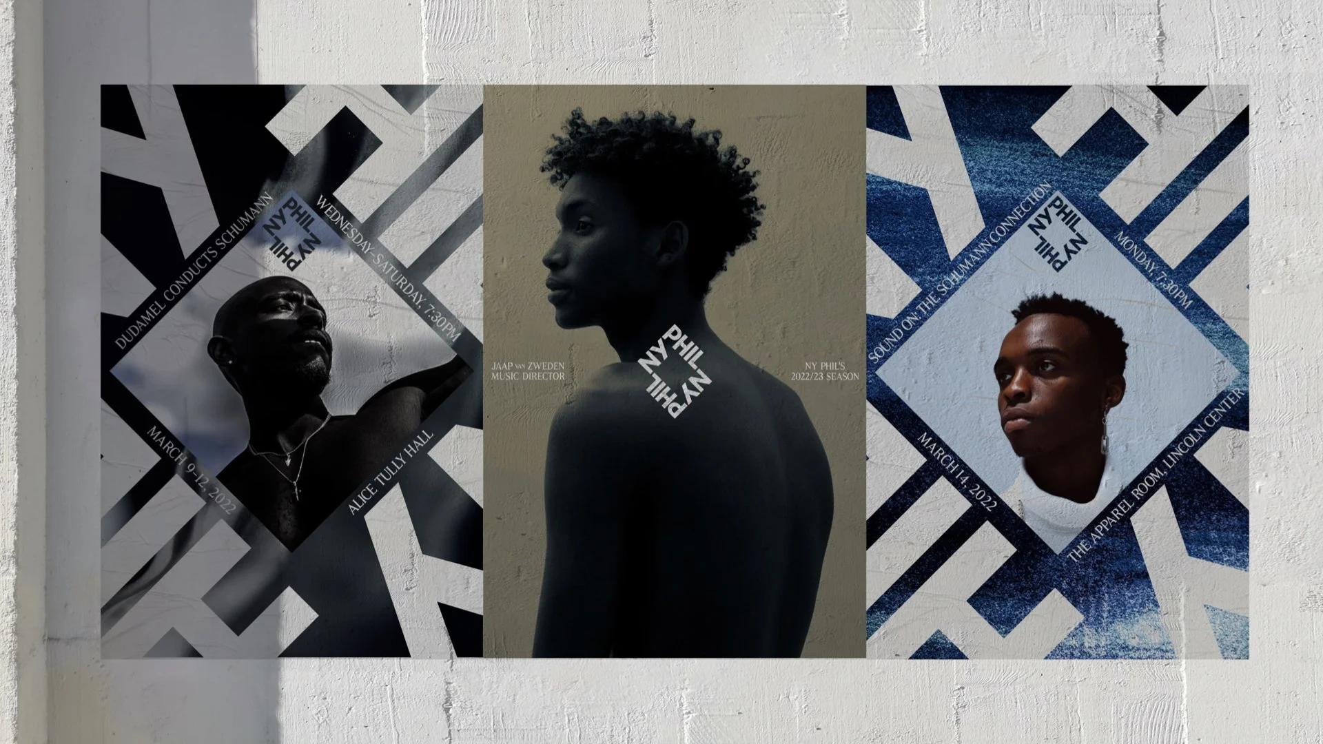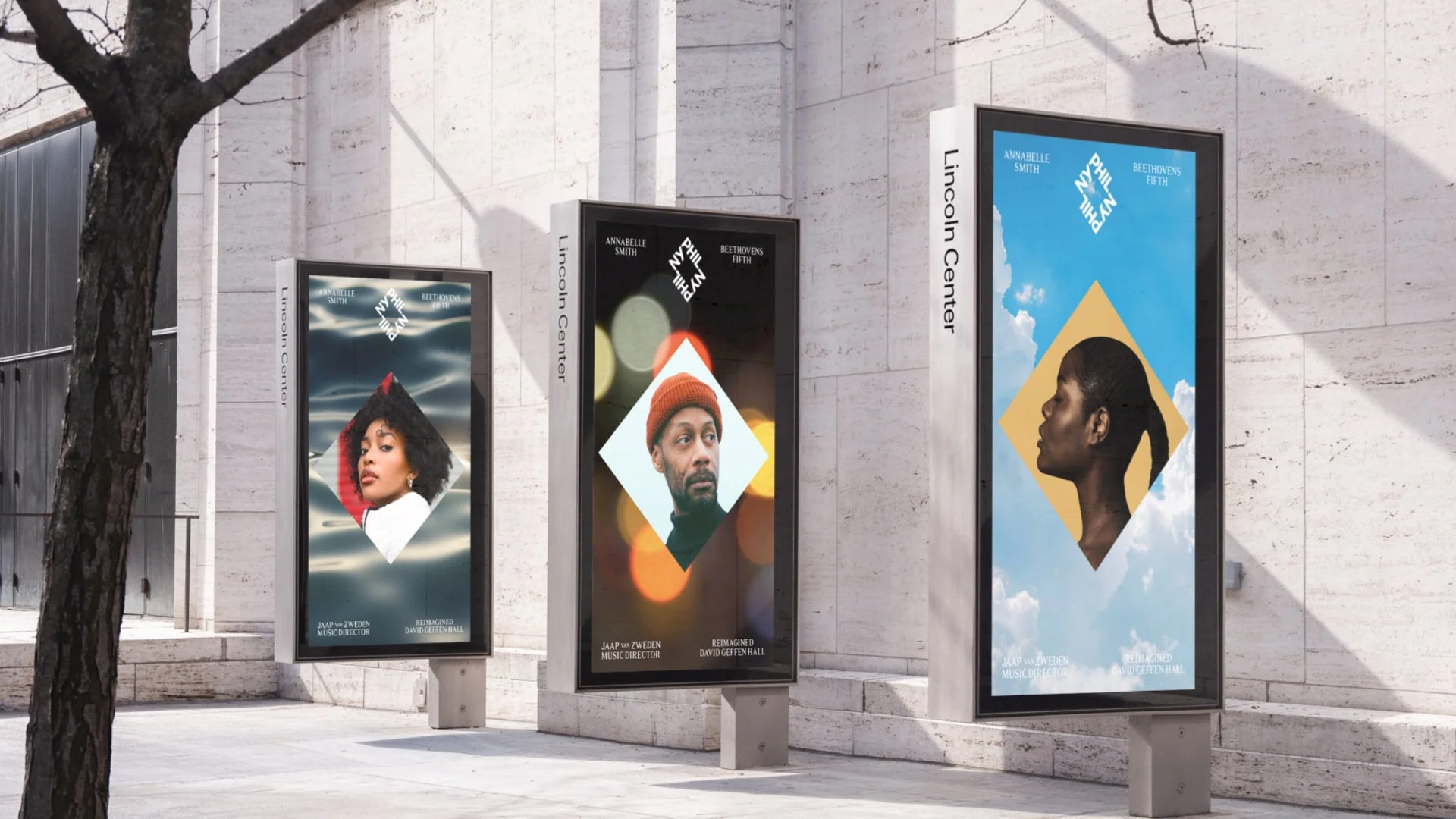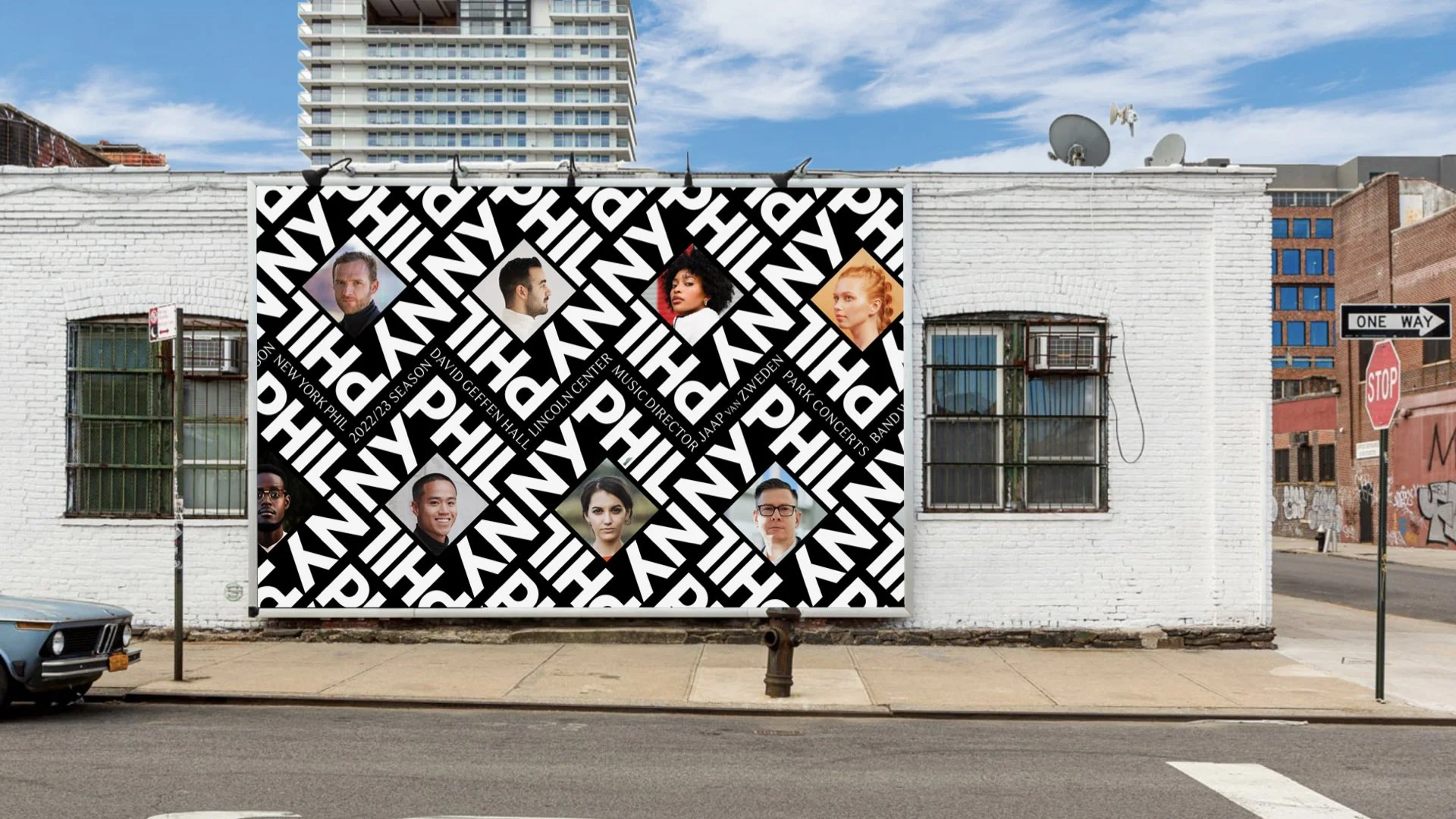 The newly reimagined David Geffen Hall brings the stage towards the centre, letting the audience surround the orchestra. The idea of surrounding a stage informed the new NY Phil logo, which can be used to frame photography and create the sense of intimacy the new hall brings. The square is a nod to the location of the hall: the Lincoln Center, a rare square inside the rectangular grid that is New York. The identity became an invitation to a new, much broader audience, inviting all New Yorkers to enjoy the NY Phil.